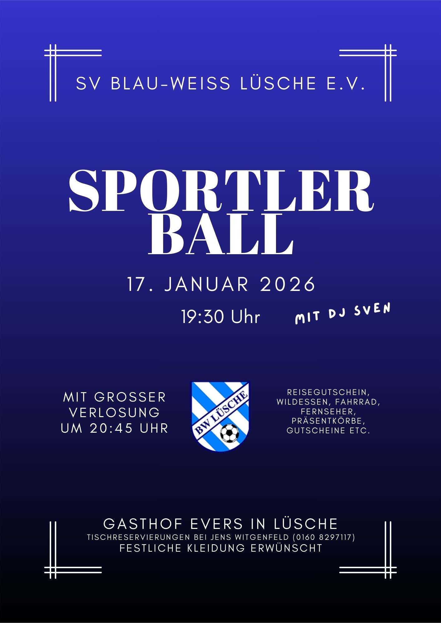 Sportlerball 2026 Am Samstag findet unser alljährlicher Sportlerball auf dem Saal Evers statt! Die zur Verfügung stehenden Tische sind bereits restlos reserviert. Aber natürlich freuen wir uns auch [...]